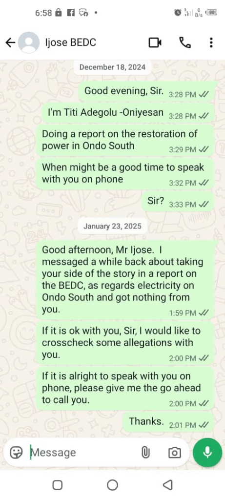 All efforts to get the reaction of BEDC head, Deolu ijose, were ignored. Messages asking his reactions were ignored, same as calls to his phone line.